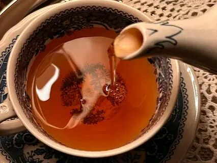 La taza se llenó y siguió sirviendo hasta que el té empezó a derramarse sobre la mesa.