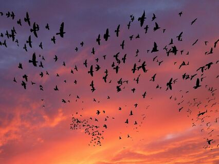 Birds flying in formation across the sky.