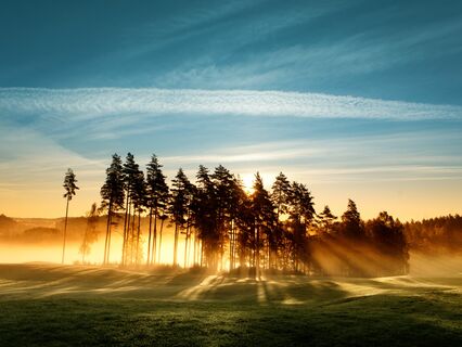 The gentle chirping of birds and the distant babbling of a stream.