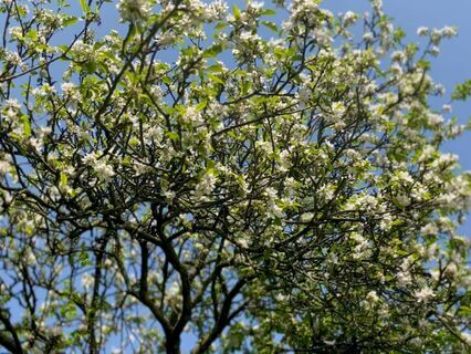 In the corner of the garden are fruit trees in full blossom.