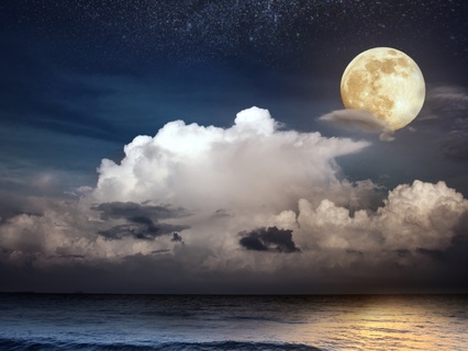 The moon rises slowly over the water,