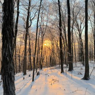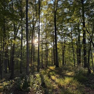 As the first warm rays begin filtering through the trees.