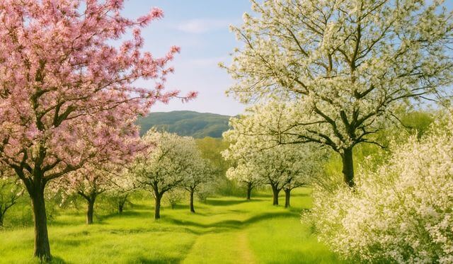 Wie die Kirsch- und Apfelbäume in voller Blüte stehen.