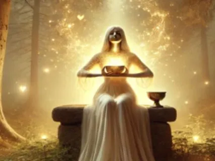 Visualisation La souveraine du cœur qui rayonne juste Installe-toi confortablement dans un endroit calme Ferme les yeux Pose une main sur ton cœur L'autre sur ton ventre Et respire profondément trois fois Sens cette douceur Tu rentres dans un espace sacré Visualise-toi marchant dans un lieu magnifique Une clairière lumineuse Entourée d'arbres protecteurs Tu laisses les rayons du soleil traverser les arbres Qui ont cette couleur verte lumineuse du printemps Et au centre de cette forêt de ces arbres Tu distingues un cercle de pierres anciens C'est ton trône d'âmes Un espace sacré réservé à toi Ton royaume intérieur Approche-toi et assieds-toi Et tu sens immédiatement un ancrage profond Une paix souveraine Une présence aimante Devant toi se présente la Queen of Cups Vêtue d'un voile d'eau et de lumière Elle sourit doucement Elle te tend une coupe d'or Dans cette coupe se trouvent ta valeur Ta sagesse,