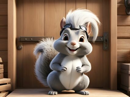 A grey squirrel with a wild tuft of fur on his head and a pair of goggles perched on his nose,