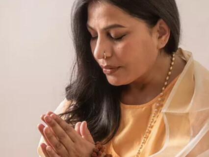Karaagre vasatey Lakshmi, Karamadhye Saraswati, Karamoole sthita Gouri, Mangalam kara darshanam. Bring your hands together and gaze at them with gentle focus. Repeat this mantra aloud or silently. Gaze first at your fingertips - acknowledge that these are the divine abode of cosmic abundance. Then, look at the hollow of your palms - acknowledge these as the abode of cosmic knowledge. Finally, gaze your wrists - acknowledge these as abodes of personal power emanating forth from your own heart.