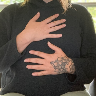 Tuck the elbows into the waistline and present the palms face up.