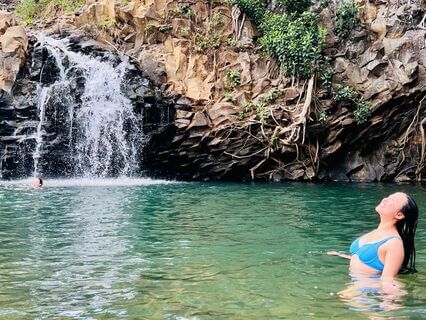 Nestled by luscious green tropical trees.