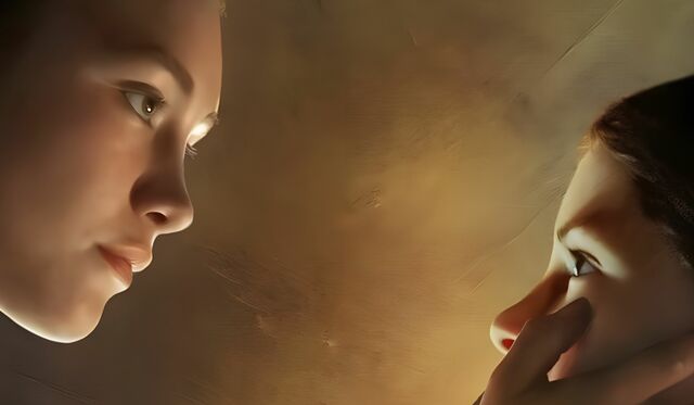 Ela percebe que a mãe alimenta a filha passando a comida da sua boca para a boca da menina,