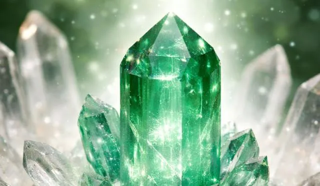 Um cristal de luz verde no centro do seu peito.