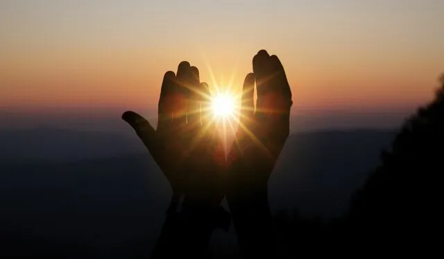 Leve as palmas das mãos unidas em frente ao peito.