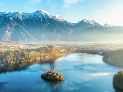 Na base de uma montanha que está próxima ao lago.