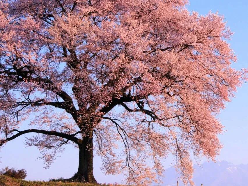Curiosos eles aparecem às vezes e depois se escondem no centro do vale está a maior de todas as cerejeiras enorme com sua copa balançando com o vento é tão grande que recobre uma boa parte do lugar onde está embaixo da árvore você percebe que tem alguém sentado em meditação,