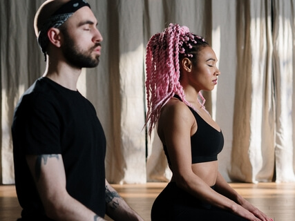 Sit in a comfortable position that can either be cross-legged on a cushion or in a chair with your feet touching the floor.
