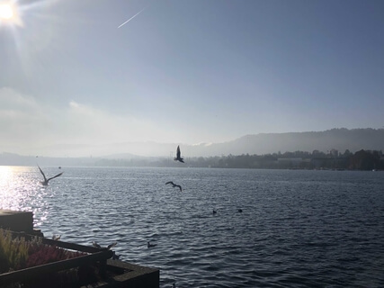 Notice the seagulls flying back and forth across the water.