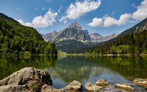 Atop the beautiful waters of this mountain lake.