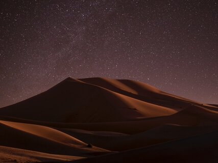 Look out into the distance and see the full moon shining its glow brightly from above the distant sand dunes.