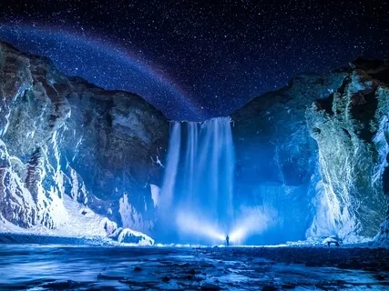 Du schwimmst zum Wasserfall und stellst dich unter ihn.
