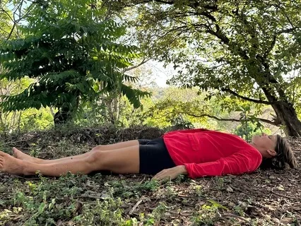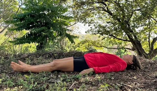 Die Arme liegen entweder locker neben Dir und die Handflächen zeigen nach oben oder Du legst Deine Hände auf Deinen Bauch und Dein Herz,