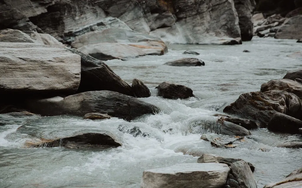 Im Wasser bilden sich teilweise Wirbel und das Wasser prallt ab und zu an grosse Steine und muss sich einen anderen Weg suchen,