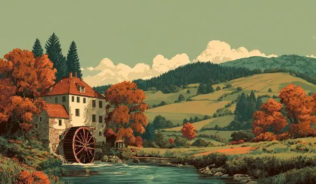Ein Fluss zog gemächlich vorüber und bewegte das hölzerne Mühlenrad,