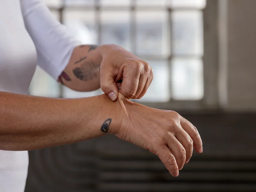 Also dass du mit den zwei Fingern von einer Hand beim Handgelenk so ein bisschen weghebst und schüttelst und auch drehst.