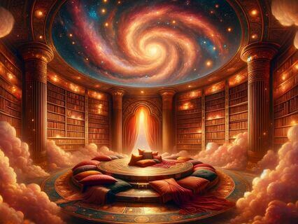 The celestial library fades into the background,