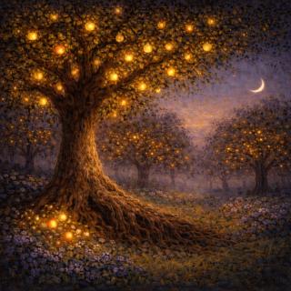 Her chest and her spine her breath lengthened then softened within the vessel the light shifted shape formed slow spirals layered and smooth turning inward and outward at the same time subtle tones appeared within it amber pearl and faint violet blending seamlessly she lowered herself onto the platform beside the vessel her body folded easily supported fully her hands rested loosely in her lap her spine lengthened her head felt balanced light from the vessel extended further filling the chamber with a deeper glow reflections gathered along the columns flowing upward and outward slowly brightening the ceiling each pane catching and releasing light in gentle succession Elowen watched it all unfold with quiet awe as the moment stretched on she noticed that within the vessel something had begun to form light condensed gradually drawing inward becoming more focused shapes emerged soft edged and luminous like petals unfolding from a central point layer by layer until the shape resolved into a floating crystal key it hovered above the vessel suspended in the light its surface shimmered with fine internal patterns intricate and alive the key turned slowly catching the glow from every angle Elowen reached toward it warmth flowed through her hand and up her arm the key settled into her palm solid and balanced smooth and gently warm as the key touched her skin light rippled outward from the platform flowing along the floor and up the walls the columns brightened their internal patterns awakening weaving complex paths through the crystal a doorway appeared along the far wall its outline was formed from condensed light clear precise Elowen stood the key resting securely in her hand her body moved smoothly guided by calm certainty she crossed the chamber toward the doorway her steps slow and even she entered a long gallery lined with glass alcoves each alcove held a floating orb of light suspended at chest height the orbs glowed softly their tones varied warm gold cool silver deep rose and pale green the gallery felt hushed Elowen wandered at an unhurried pace her breath slow matching her steps as she walked each orb responded to her passing brightening gently then settling again it felt like they were breathing with her calming her grounding her at the far end the gallery opened into a library tall shelves of translucent glass curved around the room rising high and wide books rested upon them each bound in softly glowing covers their colors muted and calm Elowen stepped inside the light was dimmer here cozy and somewhat heavier she felt her eyes relax in the glow moving forwards she reached for the nearest book the moment her fingers closed around it the cover brightened beneath the glass when she opened it light lifted from the pages and gathered just above them forming a small contained image that hovered in the air a waterfall appeared water flowed steadily downward in a narrow luminous cascade falling from an unseen edge into a quiet pool below the movement remained constant smooth and unbroken the same motion repeating again and again it was delicate the image stunning in its beauty and serenity Elowen turned the page snow began to fall large flakes drifted slowly through a soft glowing space above the book each one turned gently as it descended landing and fading as another followed every falling snowflake seemed to settle her mind a little more adding another layer of quiet and calm within her she turned another page a night sky unfolded in front of her stars held their places while faint clouds moved slowly between them the sky changed gradually deepening and lightening in subtle waves steady enough to follow without thought Elowen closed the book the image the images folded back into the pages the glow dimming to a quiet sheen she returned it to the shelf and reached for another more scenes rose above the pages as she turned them each one moved slowly each one held her attention lightly each one eased her thoughts further apart ideas drifted then thinned then softened she remained among the shelves for a long while letting the books do their quiet work her mind settling into the gentle space they left behind eventually she stepped back into the gallery another doorway waited for her beyond it the palace opened into a long high chamber this room held only instruments they rested on slender stands formed from pale glass and gold arranged in gentle curves across the floor some resembled bowls shaped like open flowers others held fine strings that caught the light tall glass tubes rose from the floor their surfaces etched with delicate patterns as Elowen entered a melody began soft at first a single clear note pure and lingering then another joined it then another the instruments played themselves each note arriving exactly where it belonged the music moved slowly unfolding in long phrases that drifted through the air and settled gently around her the tune held her attention with its gentleness inviting her to stay with it it flowed at a pace that felt natural and unhurried long even notes that lingered before fading Elowen walked among the instruments as she brushed her fingers along a glass bowl,