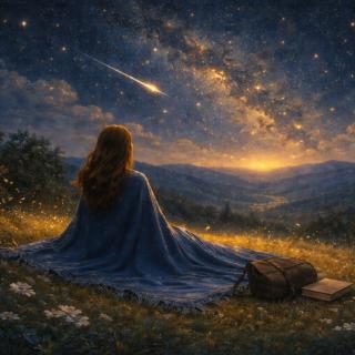 Precise Elowen stood the key resting securely in her hand Her body moved smoothly guided by calm certainty She crossed the chamber toward the doorway her steps slow and even She entered a long gallery lined with glass alcoves Each alcove held a floating orb of light suspended at chest height The orbs glowed softly their tones varied warm gold cool silver deep rose and pale green The gallery felt hushed Elowen wandered at an unhurried pace her breath slow matching her steps As she walked each orb responded to her passing brightening gently then settling again It felt like they were breathing with her calming her grounding her At the far end the gallery opened into a library Tall shelves of translucent glass curved around the room rising high and wide Books rested upon them each bound in softly glowing covers their colors muted and calm Elowen stepped inside The light was dimmer here cozy and somewhat heavier She felt her eyes relax in the glow Moving forwards she reached for the nearest book The moment her fingers closed around it the cover brightened beneath the glass When she opened it light lifted from the pages and gathered just above them forming a small contained image that hovered in the air A waterfall appeared Water flowed steadily downward in a narrow luminous cascade falling from an unseen edge into a quiet pool below The movement remained constant smooth and unbroken the same motion repeating again and again It was delicate delicate the image stunning in its beauty and serenity Elowen turned the page snow began to fall large flakes drifted slowly through a soft glowing space above the book Each one turned gently as it descended expanding and fading as another followed Every falling snowflake seemed to settle her mind a little more adding another layer of quiet and calm within her She turned another page A night sky unfolded in front of her Stars held their places while faint clouds moved slowly between them The sky changed gradually deepening and lightening in subtle waves,