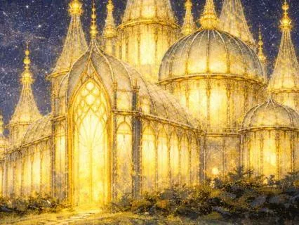 Heaviness and relaxation with every exhale time stretched on moments unfolded without edges her body grew loose and heavy against the blankets nestling into their warmth the last traces of movement softened stillness gathered and she allowed herself to rest fully nothing but peace complete comfort pure contentment the palace held her there for a long while simply resting simply being granting her all the time she needed when Elowen felt ready she rose slowly and easily deep calm still holding her as she stood the glow around the room shifted subtly a new doorway appeared it formed opposite her resting place its shape emerging from the wall like a slow breath light gathering and clarifying until an opening stood where there had been none before she stepped toward it as she passed through the glow shifted once more and she found herself back in the entrance hall light filled the palace from every direction it gathered inside the glass itself resting within the walls the columns the high curving ceiling the glow carried colour soft gold pale opal faint green blended so evenly that the air itself appeared luminous the space held a quiet harmony one that couldn't help but calm the mind and quiet the need to think Elowen stood within it the entrance hall rose vast around her wide and magnificent a polished stone floor stretched outward reflecting the glow above in softened shapes two sweeping staircases curved upward from either side their steps formed from pale glass that held a gentle inner shine they met at a high landing then continued upward into balconies and upper halls that disappeared into light above her hung a great chandelier it floated beneath the ceiling formed from hundreds of suspended glass pieces each one shaped differently light travelled slowly through it cascading downward in layers gathering and spilling across the hall in a steady unbroken glow the beauty and calm of the space settled around her her shoulders lowered her breath deepened and her weight spread evenly through her feet grounding her in the moment the stone beneath her felt warm gently heated and polished smooth through time beneath its surface wide bands of colour drifted slowly moving in long arcs that flowed beneath the palace like a calm current across the room beneath the grand staircase a wide hall opened framed by tall glass columns each column held fine threads of light within it looping and branching through the crystal in intricate patterns as Elowen stepped forward the patterns brightened responding with a soft pulse that travelled upward and then faded she walked steadily onwards as the hall guided her deeper into the palace light thickened here growing deeper and richer reflections drifted along the walls slow and fluid lingering as though the glass remembered movement long after it passed the air felt dense and supportive against her skin each breath filled her chest expanding then easing the hall widened into a vast inner chamber its ceiling rose high above her formed from overlapping panes of crystal arranged in gentle curves light passed through them in gradual shifts creating slow waves of colour that travelled downward and settled across the room at the centre stood a circular platform it rose slightly from the floor its edge traced with a thin line of glowing crystal upon it rested a low structure formed from layered glass shaped like an open vessel light gathered inside it,
