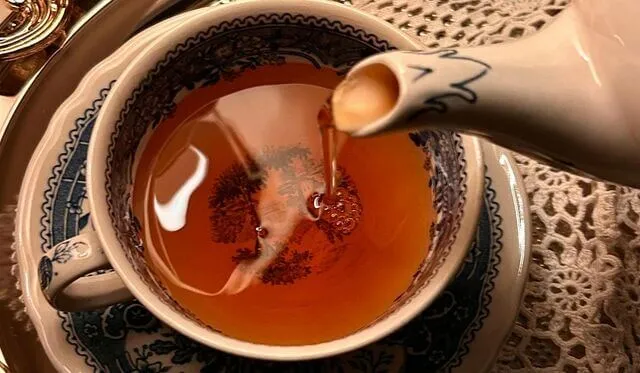 La taza se llenó y siguió sirviendo hasta que el té empezó a derramarse sobre la mesa.