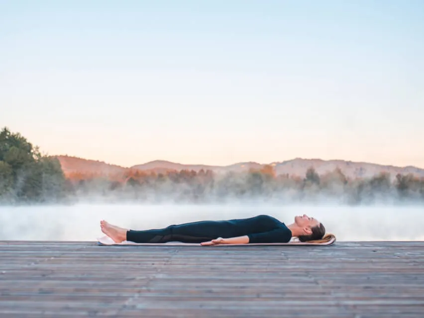 Deja tus manos al lado de tu cuerpo con la palma de las manos hacia arriba y si lo necesitas pon un cojín bajo tus rodillas y bajo tu cabeza y cúbrete con una manda ya que la temperatura del cuerpo baja.