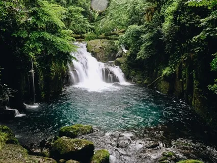 Una cascada que tiene un fluir relajado del agua y comienzas a sentir como cae desde tu cabeza por todo tu cuerpo,