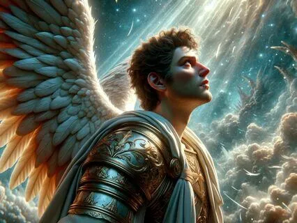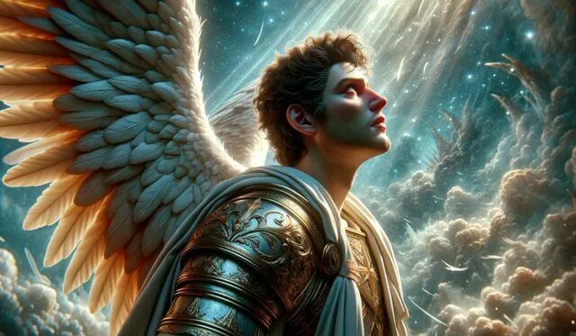 El Arcángel Miguel está envuelto en una inmensa aura que desprende autoridad y grandeza.