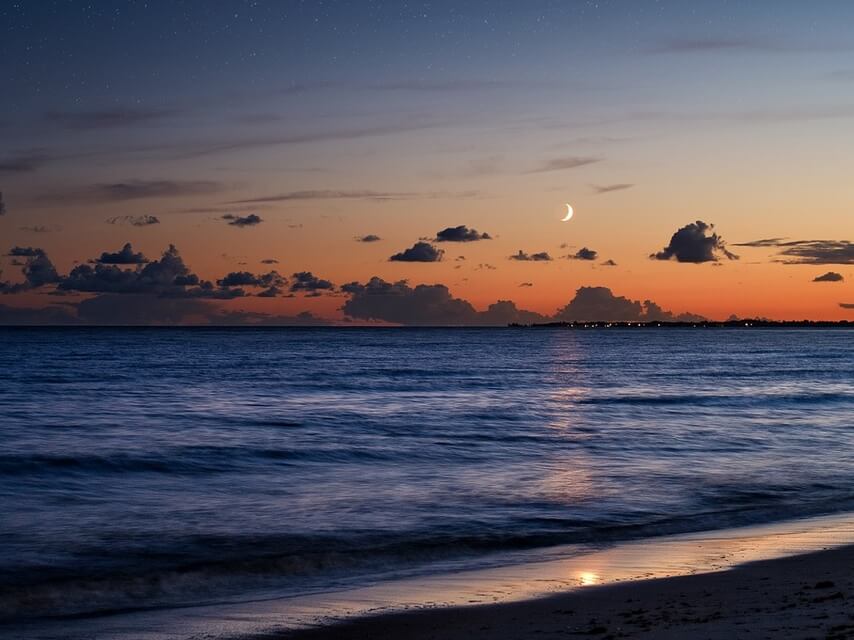 La luz de la luna se refleja en el agua y las olas del mar rompen a tus pies dejando una espuma blanca,