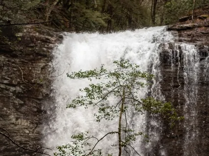 Al pie de este denso árbol hay una casa de paredes sólidas sin ventanas.