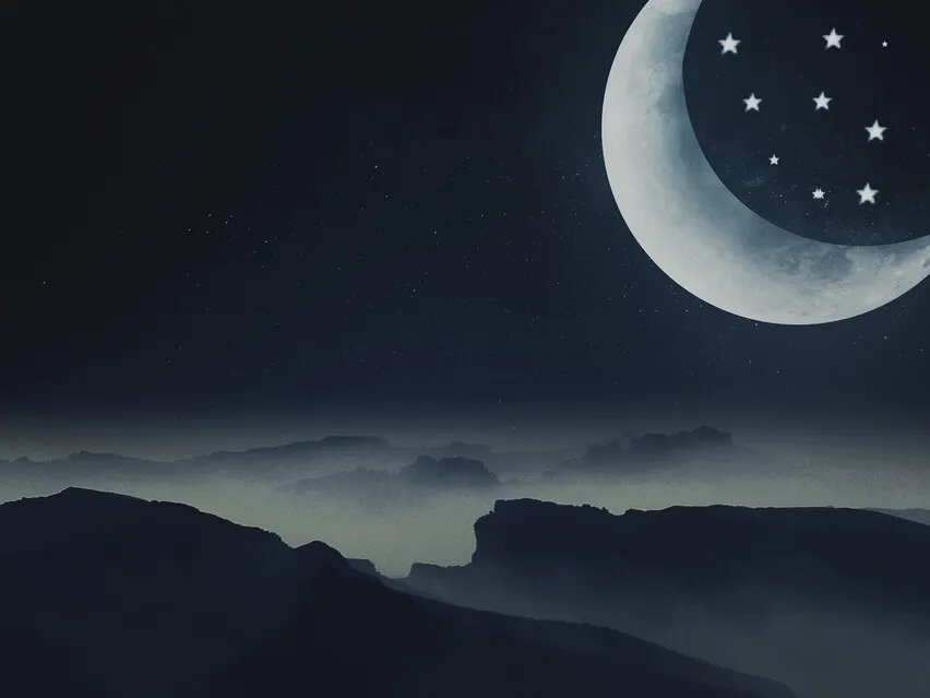 Une lune splendide semble se balancer entre les mâts,