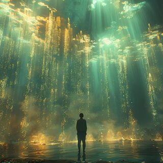 With the distant sound of a roaring waterfall.
