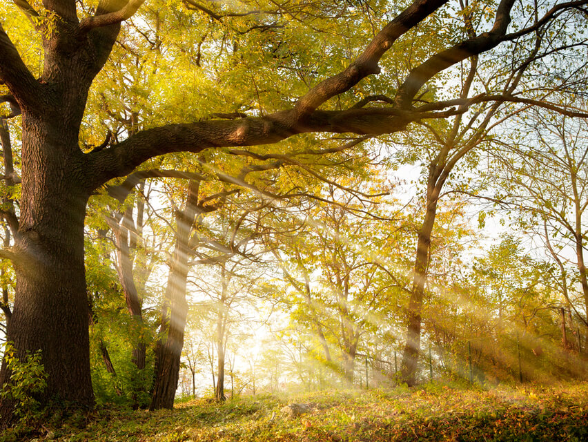 You walk into the forest and the sun's rays are filtering down through the tops of the tall trees,