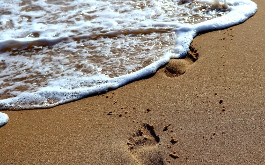 Osservando l'impronta che subito una piccola onda si affretta a cancellare.