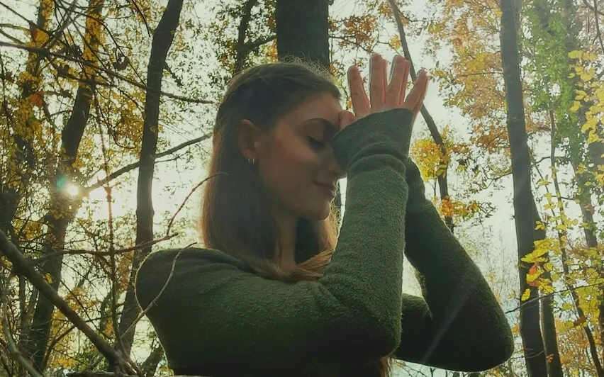 Respira profondamente e unisci i palmi delle mani davanti al petto.