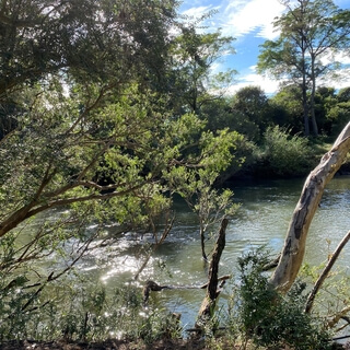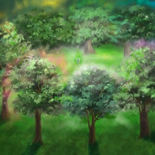 You see a lush forest in the distance.