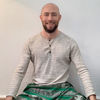 Cross-legged on a cushion,