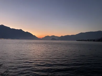 Du kannst nun die ersten Sonnenstrahlen hinter den Bergen hervorscheinen sehen.