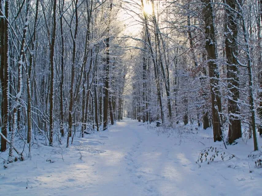 Du stehst in einem wunderschön verschneiten Wald.