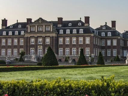 Set a ways off the road and surrounded by fields of wheat and pastures where cows graze on lush grasses.