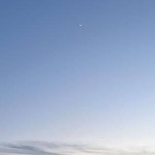 A moon appears full in the pale blue light at dusk.