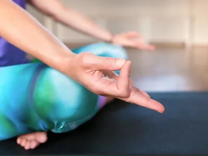 Kom zitten in een kleermakerszit en plaats je handen op de knieën.