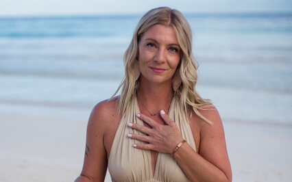 Places a hand on your heart and instructs for you to do the same.