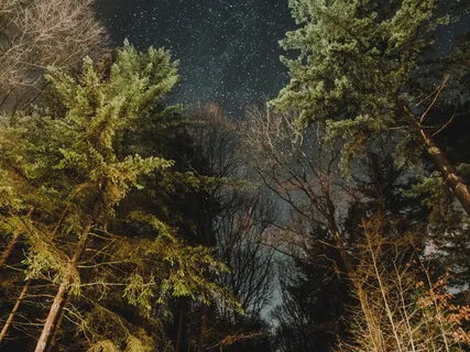 Enorme grote dennenbomen die tot ver in de hemel rijken.